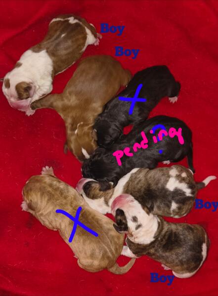 message parkerfarms about this ad Only 4 males left and 1 Black possibly brindle female who is pending. These guys are amazing what was an unintended pairing between our black brindled Boxer and Red Pit producex these chunky babies who will be ready just in time for Christmas. These babies will come with their shots up to date wormed on a regular basis they will come with a starter sample of food and a blanket with mom's smell to help them transition into their new home. The we'll be socialized daily and started on pee pad and crate training before they go to their new families. The males are $300total and we are accepting a $150 dollars deposit to hold your pick. We will update on a regular basis as they grow please feel free to ask any other questions |