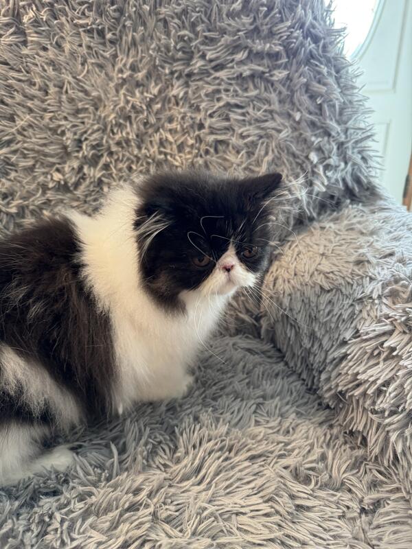 message purrsianpals about this ad ADOPTED This adorable black and white male kitten is available now. He had been reserved for a couple however they decided they want a female instead. This guy was born 3/28/25, has had all his recommended vaccines and been wormed. Very friendly kitten who would love to have a new family to cuddle with. He will make a great pet for his new family. Contact me for more info/video on this boy. Please refer to kitten #2 when inquiring about him. Excellent bloodlines.Located in North Central Ohio. |
