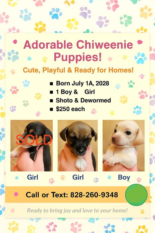 message ajc1005 about this ad Our sweet Chiweenie puppies were born on July 14th and are now ready to meet their new families! We have 1 girl and 1 boy (white/cream These little ones have been raised indoors, are well-socialized, and are doing great with puppy pads and solid puppy food. Theyve had their shots and deworming, and each one is healthy, playful, and full of love! Rehoming fee: $250 Call or text April: 828-260-9348 Bring home a new best friend today! |
