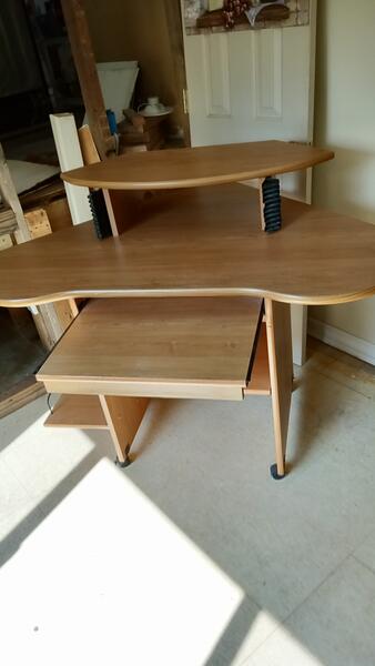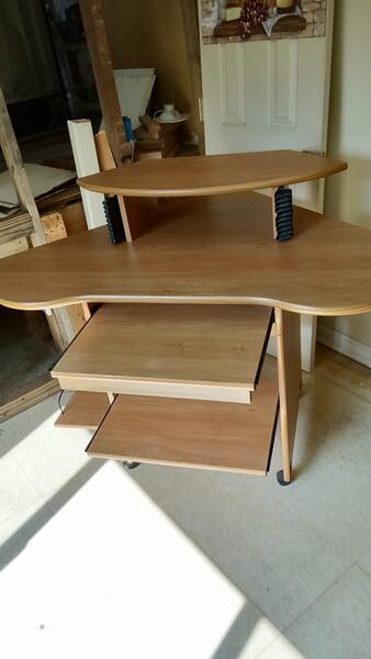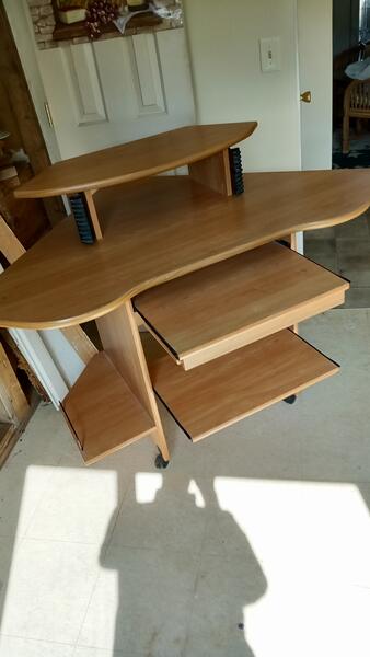 message wngdnglhwgl about this ad Corner Wood Computer desk, 4 roller wheels for moving around, dimensions 41" x 41" from corner; 32" from floor to large desk top area; 36" long top shelf, pull out lower shelf; pull out key board shelf. $60 Call Greg 859-635-6149 |