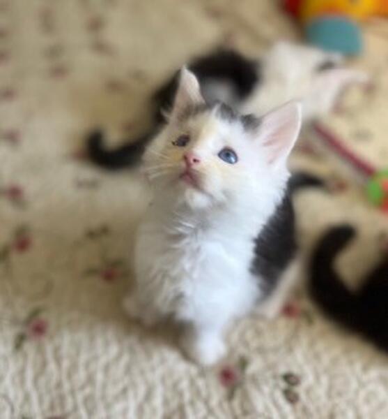 This kitten is from our newest litter born on September 9th. Mom is a blue eyed Black Tortie/White and Dad is a Black Silver Classic Tabby/White. Both parents are polydactyl. Both parents have been tested and are negative for Feline Leukemia and Aids. Please contact me if you are interested in more information on owning this sweet baby. Breeding rights are available at an additional cost. Kitten will be ready to go after 11/18.