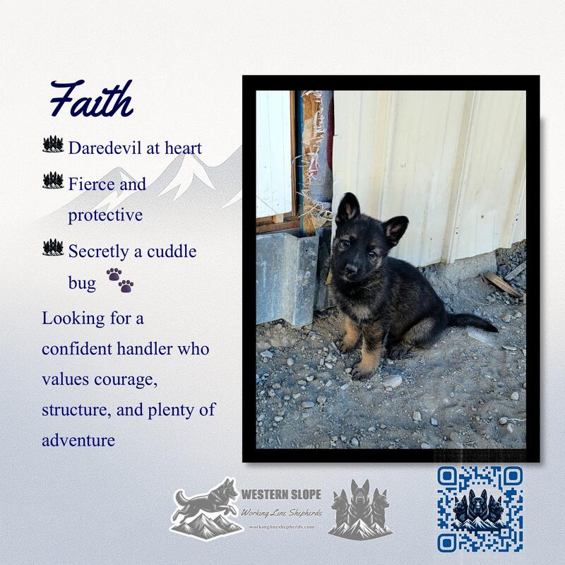 message wswls about this ad Available Tuesday, December 2 Temperament proof available via video $500 deposit is required to hold Full payment due before pickup Fully dewormed and 5-way vaccinated Vet check & microchip scheduled after deposit (per health guarantee) Located in Delta, CO Placement by contract only Faith is the way she loves you. Named after Faith Hill, shes got a gentle soul, clear eyes, and a temperament built for partnership. Calm, focused, and emotionally attuned, Faith is ready to bond deeply and work with purpose. AKC-registered working-line German Shepherd pup out of Abel ze Sonorske Oazy Kimber (Xarma de Ola-Zar Abels grandsire, Jakub Sov mln, placed 6th at the Czech IGP3 Nationals and was a substitute for the FCI World Championship. Kimbers maternal granddam, Karo z Udoli Upy (IPO3/SchH3/ZVV3 won the 2020 IGP Czech National and competed at the 2021 WUSV World Championship. Available starting Monday at 8 weeks. Temperament proof available via video. A $500 deposit is required to hold. Full payment is due before pickup. Vet check and microchip scheduled after deposit, per health guarantee. Located in Delta, CO. Serious homes only. message wswls about this ad |