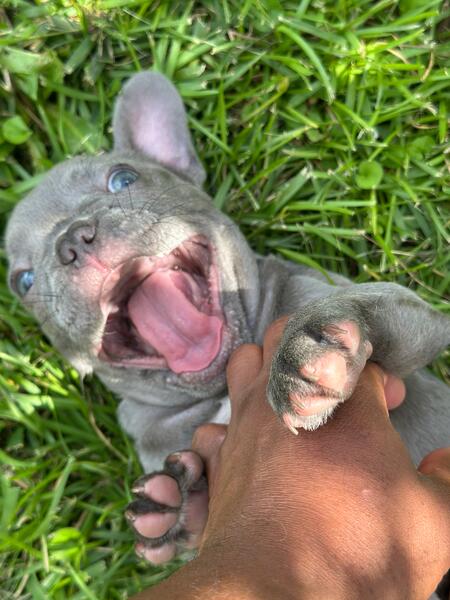 message tuscaloosafrenchies about this ad 1. Basic Information Breed: French Bulldog Gender: Female Color/markings: Blue Age: 16 weeks old Weight: 11.25 pounds 2. Health Information Vet-checked with date of last exam: 08/16/2025 Vaccination records: Complete vaccination set - DAPP, DHLPP, Bordetella, Rabies, and fecal exam Dewormed schedule: 1x/month Simparica Trio No Microchip 3. Registration & Pedigree AKC registration: Full rights 4. Care & Training Potty training progress: Crate trained; potty training in progress Temperament: playful, cuddly, good with kids and pets Feeding routine: Royal Canin 3x/day 5. Pricing & Terms Price: $4,000 Payment options accepted: Cash, Zelle, Venmo, and PayPal 6. Whats Included Starter pack includes food, toy, blanket and health records 7. Location & Pickup/Delivery Options Delivery available for 50-mile radius of Birmingham and Tuscaloosa, Alabama Distance of delivery can be discussed *If interested in Cartier, please send a message to schedule a meet and greet or to purchase directly. message tuscaloosafrenchies about this ad |