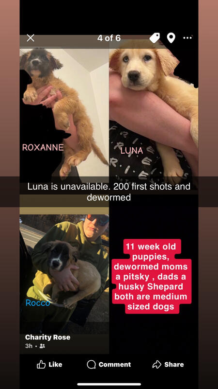 message chrtf8818 about this ad Born Aug 19th,2025 Mom is a pitsky dad is husky Shepard both medium sized dogs These puppies are high energy so if you can not commit to the time and energy they require please find another dog that would best suit you. I have 3 girls and 2 boys available. The all brown dog is a female named Princess Leia Rocco and Roxanne look so much alike Ariel is all white with hazel eyes Leonardo is all white with hazel eyes There is a delivery fee if I bring the puppy to you. No holds unless there is a deposit which comes out of the total. All vaccinated and dewormed. You can reach me at 443-876-7270 with any questions text only. |