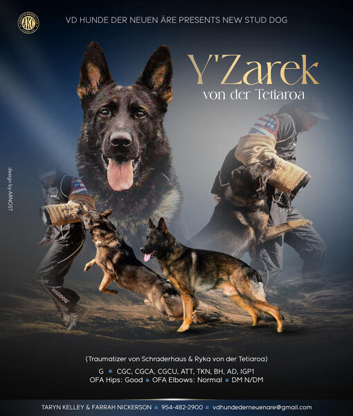 message vdhundederneuenare about this ad G YZarek von der Tetiaroa CGC, CGCA, CGCU, ATT, TKN, BH, AD, IGP1 Zar Born in the USA HD: Good (OFA) ED: Normal (OFA) DM: Carrier AKC DNA + Health: Pending Sable Born 06/06/2017 Pedigree- Sire: Traumatizer von Schraderhaus BH, IPO3 HD Good, ED Normal, DM Carrier Dam: Ryka von der Tetiaroa BH, AD, IGP1 HD Good (ZW 73 ED Normal, LUW1, DM Clear Co-Owned with Taryn Kelley |
