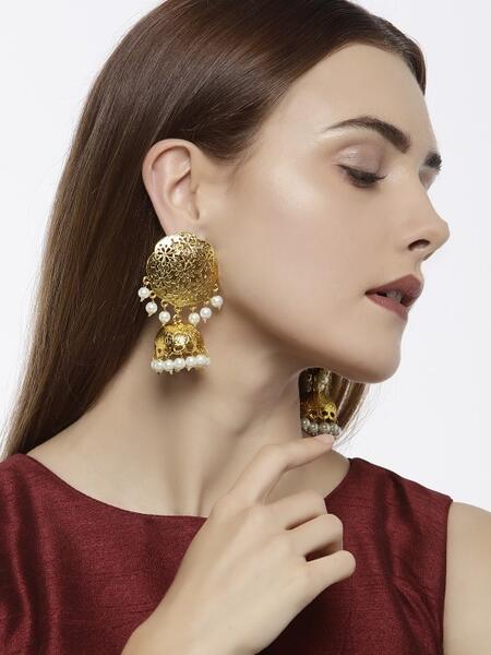 message rohinee about this ad Product Code: 6941248 Gold-toned dome shaped jhumkas, gold-plated, has pearls Secured with a post and back Earring Length- 7.5 cm, Earring Width- 5 cm Earrings from Zaveri Pearls will add a modern twist to your jewellery collection. Match this gold pair with a maxi or flared dress for your next lunch date. Material: Alloy Stone Type: Pearls Care Instructions: Wipe your jewellery with a soft cloth after every use Always store your jewellery in a flat box to avoid accidental scratches Keep sprays and perfumes away from your jewellery Do not soak your jewellery in water Clean your jewellery using a soft brush, dipped in jewellery cleaning solution only httpsmyntr.it/ZI49Kj4 |