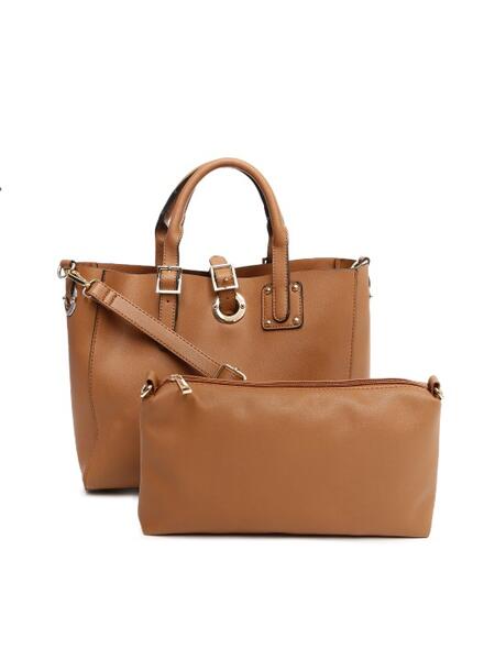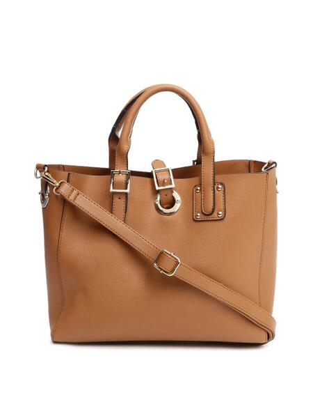 message rohinee about this ad Product Code: 1642578 Tan brown handbag, secured with a buckle closure Two short handles, one long detachable and adjustable sling strap One main compartment One external slip pocket on the back Comes with a detachable pouch, has one zip pocket and two slip pockets Handbag Height: 26 cm Width: 30 cm Depth: 9 cm Sling bag: Height: 18 cm httpsmyntr.it/Z0z5pgV |
