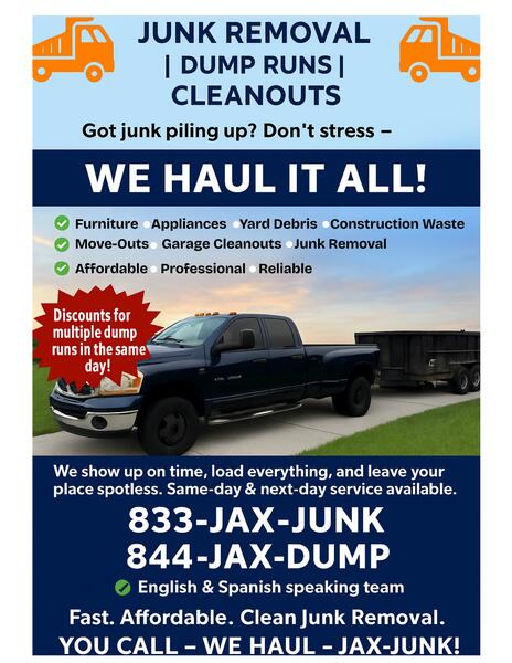 message enzorottweiler about this ad Need junk gone fast? JAX DUMP offers same day junk removal + haul away services in Jacksonville and surrounding areas. Cheaper than a dumpster we load it, we haul it, you relax. household junk furniture & appliances yard debris construction cleanup garage / shed cleanouts Fast, reliable, and local. Call 844-JAX-DUMP for a free estimate. |