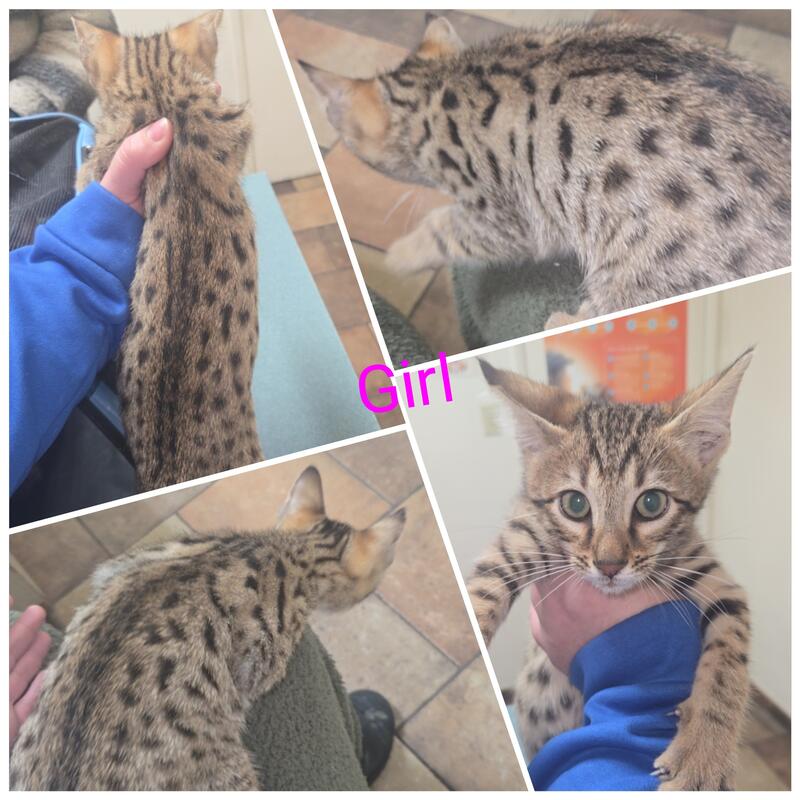 message pinkkris about this ad F3 kittens available 9 weeks 1set shots Dewormed Available as pet homes or with registration rights Male 1 blue writting: Available Male 2 red writting: Sold 600 no papers 1600 tica papers and rights Female 900: Sold 1900 tica papers and rights Local pick up I can meet at an airport port with compensation of travel time in advance with kitten deposit. Or your welcome to use a ground shipper that I use or your own. Kitten must be paid in full before leaving. |