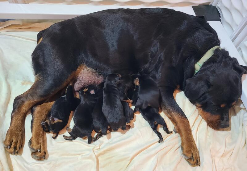 message rottqueen about this ad sire: Garin Von Stuttgart CGC OFA CHIC #164383 (OFA Hips GOOD and Elbows Normal, OFA Eyes Normal, OFA Cardio Normal/Clear, JLPP Clear, DNA #V937417, AKC Star Puppy Award, and Canine Good Citizenship Award, also trophy and ribbon see website) Dam: JLPP Clear, heart good Down from several champions. Litter born 12/4/25 $1700 pet only, more for breeding rights I docked this litter. please email me for pedigree information Delivery available with a fee. Another litter due 12/20 and they will have the natural tails. All puppies go home with 1st shots, deworming and also microchipped. |