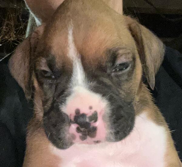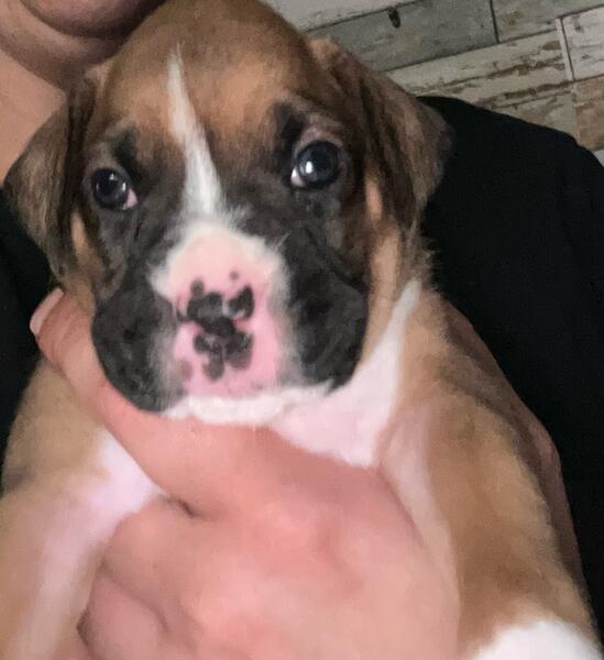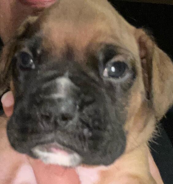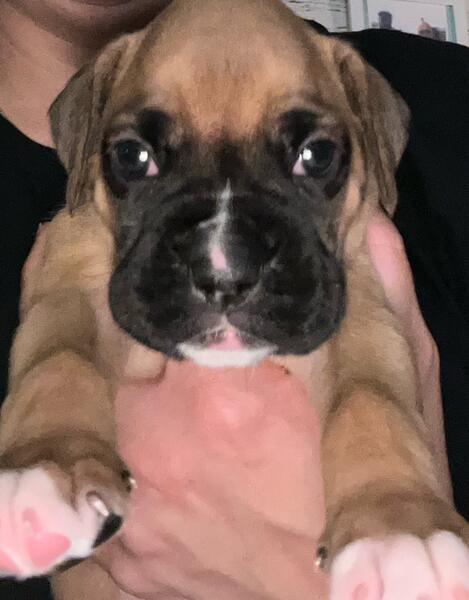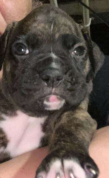 message sage about this ad 6 boxer puppies born on 5/24/25. There are 3 male and 3 female. Father is purebred fawn boxer and mother is purebred brindle boxer. They will be available to go to a new home the week of 7/20/25. |