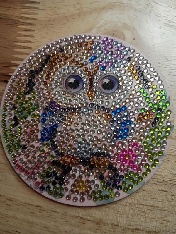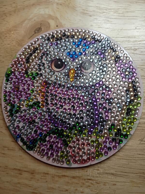 Handmade diamond painting owl coasters and holder. $25