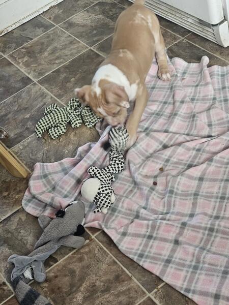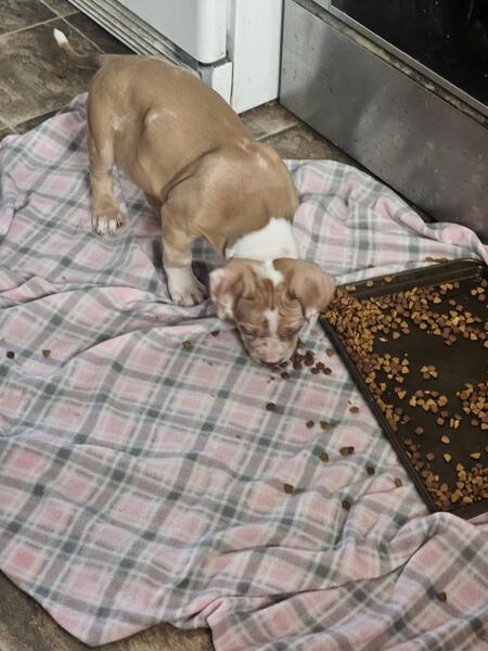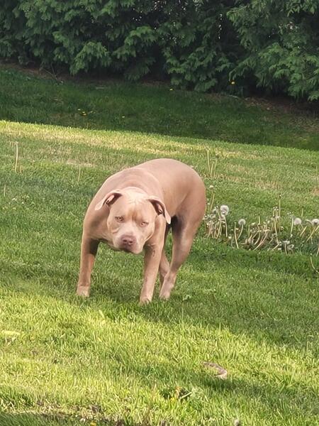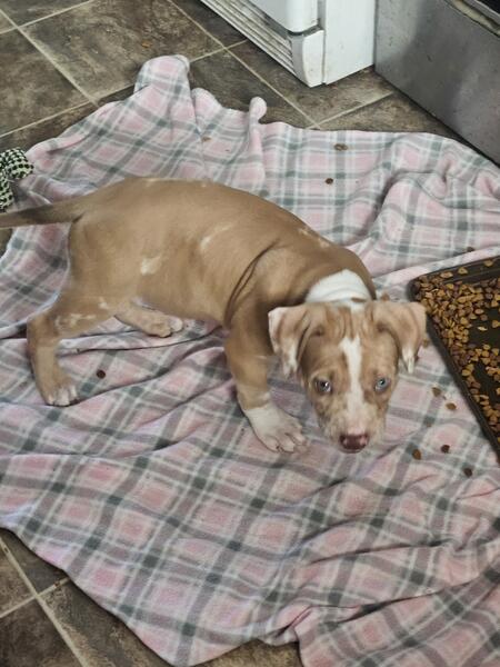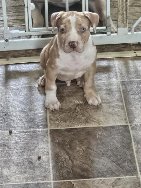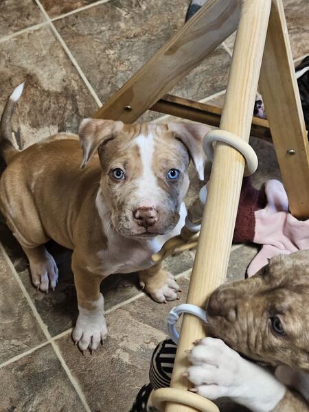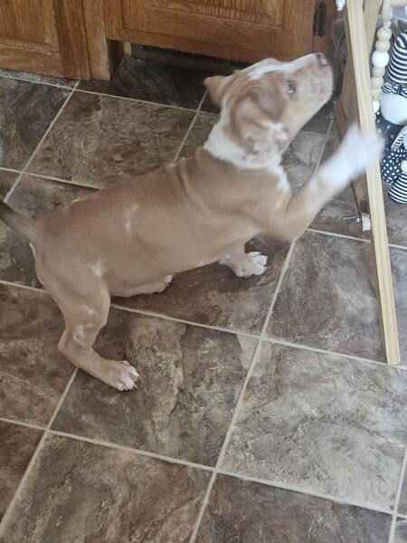 message heavenlyhope about this ad American Bully Chocolate Merle Male. He is ready to go. Mom is a Standard Lilac. Dad is a Brindle Merle. He is up to date on shots and deworming also microchipped. Vet checked and health cleared. ABR and ABA Registered. Pet Home $800 Full Rights $1500 |