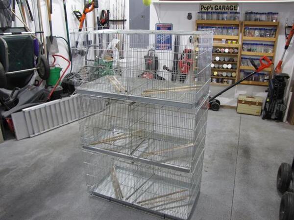 message keetsville about this ad Breeding cages with dividers. Each divided cage is 18" x 18" x 18" with a overall length of 36" and includes a single slide out tray. Each divided cage has nest box doors on the front and side. Cages are in used condition. No cage stand is available. Must pick up, shipping is not offered. Offered at $45. |