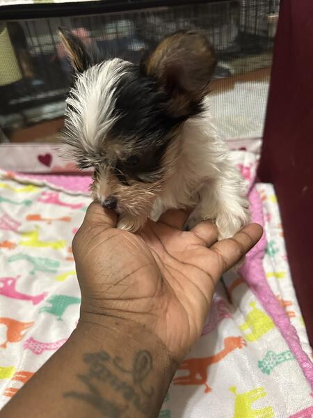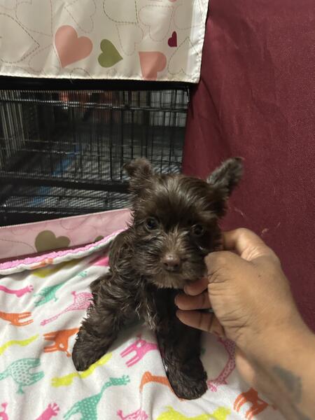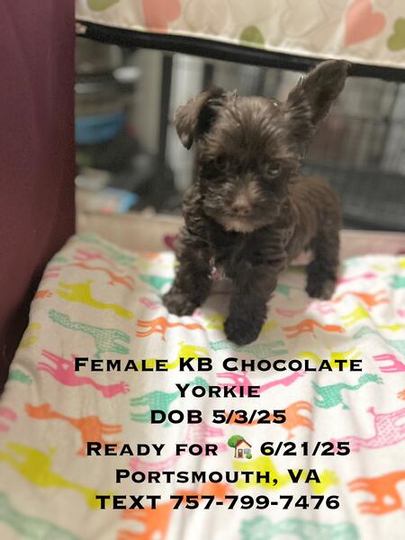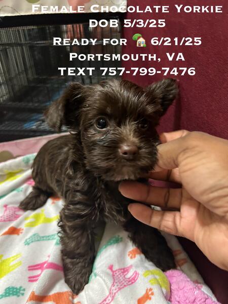 message mrsyorkie about this ad CKC yorkies Traditional male $1000 charting approximately 5lbs as adult. DOB 5/3/25 KB Chocolate female $1600. (Semi negotiable) Charting approximately 4.5 lbs as adult DOB 5/3/25. Mom 6lbs Parti yorkie ckc Dad 4.5lb Chocolate yorkie akc/ckc Comes with Age appropriate shots & dewormed Tails docked & dewclaws removed 1 month free pet health insurance via Trupanion. Located in Portsmouth VA Fastest response TEXT 757-799-7476 |