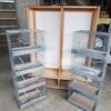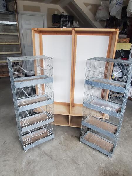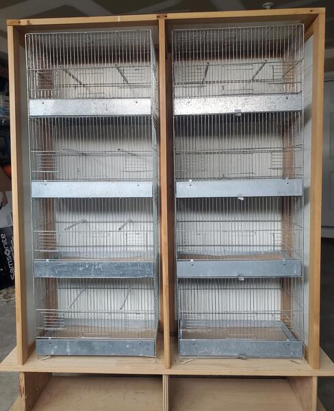 message timbrados about this ad 2 Four Stack Cages - 18" X 9.5" X 48" in excellent condition. Each set includes: 4 METAL TRAYS 4 METAL FLAPS 8 PLASTIC OUTSIDE (not shown) 4 WATER BOTTLES (not shown) 8 PLASTIC PERCHES 4 FRONT DOORS 8 SIDE DOORS Homemade wooden Encasing on caster wheels, keeps the surroundings clean. |