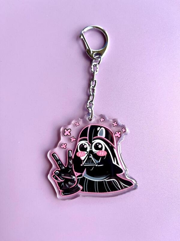 message flyingnimbyco1 about this ad Exclusive Darth Vader Keychain. The cutest Darth Vader ever! Bring a touch of cuteness to the Dark Side with this Kawaii Darth Vader Keychain! This unique keychain features the iconic Sith Lord flashing a peace sign, with sparkles in his eyes and surrounded by flowers. Its the perfect accessory for Star Wars fans who love a cute twist on classic characters. FlyingNimbyCo.com |