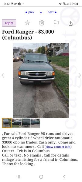 message carnut about this ad 1996 ford ranger 180000 miles 4 cylinder Automatic Runs great Call or text 614-282-6913 Asking 3000 Thanks for looking No scammers if u want it come look at it . |