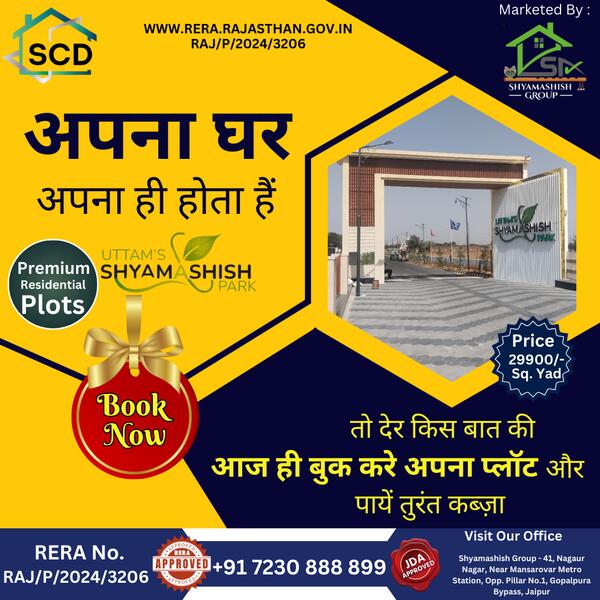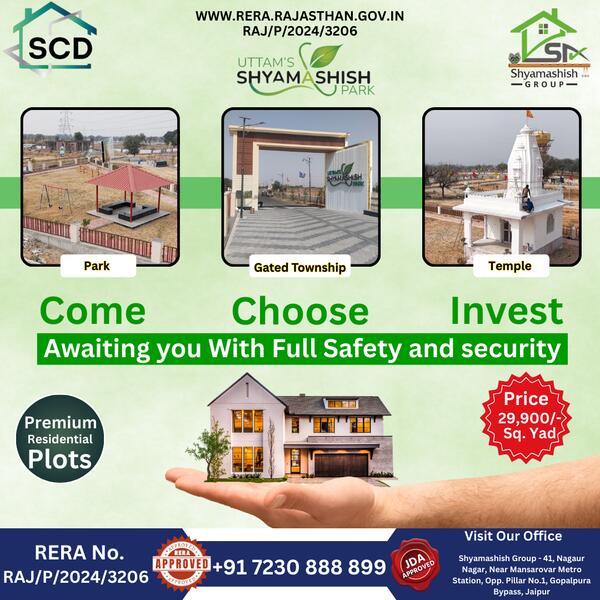 message scdproiects about this ad Uttam Shyamashish Park by SCD Projects offers premium residential plots on Ajmer Road, Jaipurs most promising real estate corridor. This JDA-approved gated township provides the perfect blend of modern infrastructure, security, and convenience ideal for building your dream home or investing in future-ready property. Strategically located near Mahindra SEZ, schools, and major roadways, it ensures high returns and superior living standards. With flexible plot sizes, wide roads, landscaped parks, and all essential amenities, Uttam Shyamashish Park is the destination for smart buyers seeking value and lifestyle. |