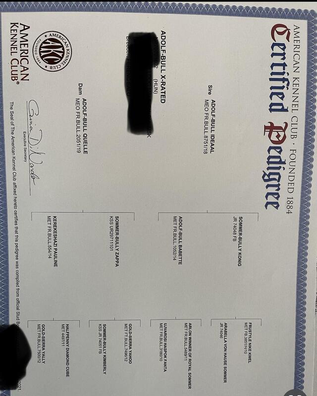 message ddb811 about this ad Grand Champion Adolf-Bull X-Rated is a Hungarian import. AKC registered. Grandson of Zappa & Konig. Health panel cleared. Carries cream & blue 937-219-3373 |