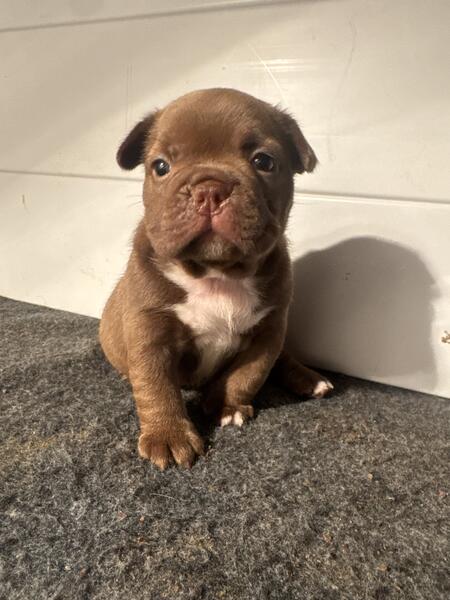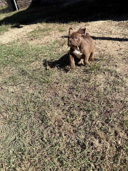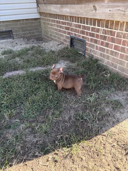 message wnbbyzus about this ad Female frenchie puppy. 2.5 months old. Chocolate colored, compact and thick Great perosnality and very smart. $3000 She does carry cocoa, tri, and blue. Call or text 910-806-538o |
