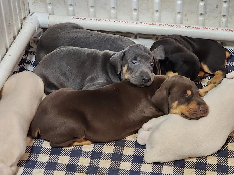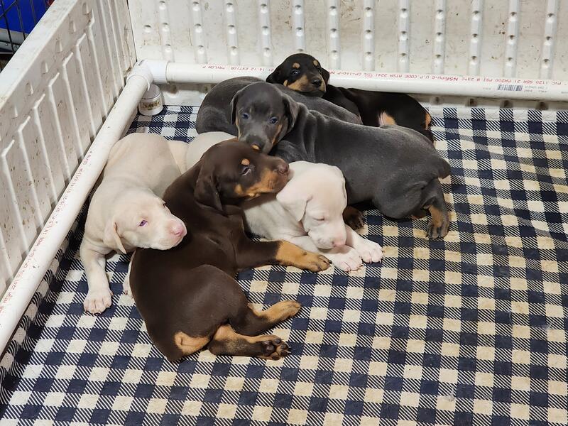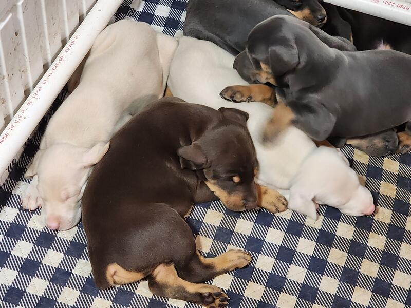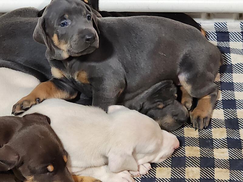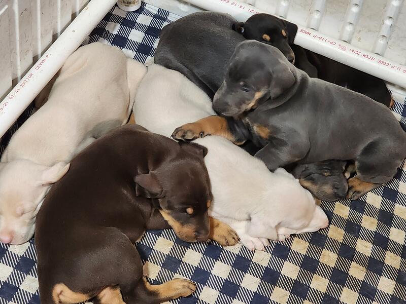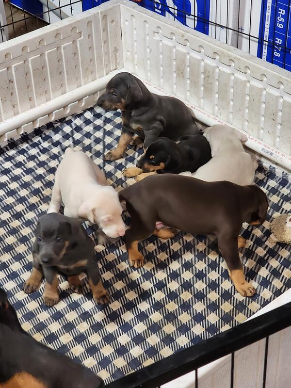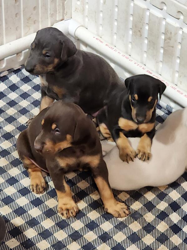 message rlnzn8566 about this ad Beautiful purebred Dobies. Various colors. Males and females. Mom is a full Black/Rust American Dobie. Dad is a full Blue European Dobie. The puppies are presently 4 weeks old. Very healthy and happy pups. |