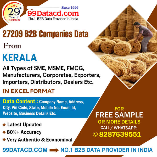 message dataprovider about this ad Looking for a verified list of companies in Kerala? 99Datacd is a leading B2B database provider company in India, offering an updated list of companies in Kerala. Buy 27209 Companies data from KERALA Business, Industry, and Trades ( All Types Of SME, MSME, FMCG, Manufacturers, Corporates, Exporters, Importers, Distributors and Dealers) - In Excel Format. Directly contact our expert team and get an exclusive list of companies in Kerala at affordable prices. Our data content includes essential details such as company name, contact number, address, pin code, email ID, and more. Flat 30% OFF on all database purchases at 99Datacd! Hurrydont miss this limited-time offer! Contact for Free Sample Data or More Info Call/WhatsApp: 8587804924, 8287639551 Email: sales@99datacd.com Address: 206, RG Trade Tower, Netaji Subhash Place, Delhi - 110034, India Website: |