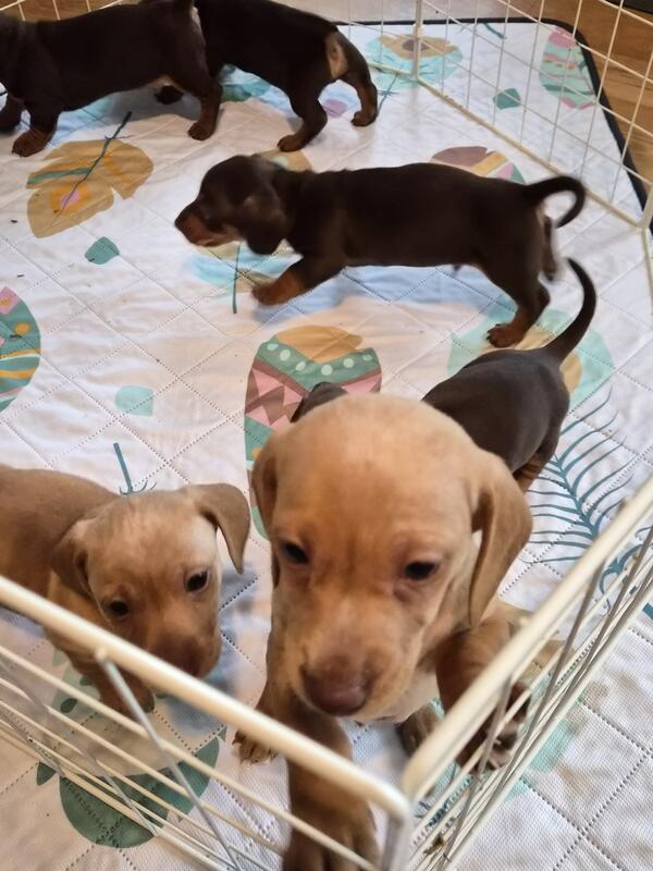 message nicnic about this ad We have 5 male dachshund puppies for sale. Born 11/20/25. Mom is a 12# chocolate and tan and dad is a 12# piebald chocolate and tan. 2 cream colored males and 3 chocolate and tan males to choose from. Ready to go 1/8/25. Located just north of Gaylord, Mi. Both parents on site. Text is best 23! 8!8 O52! |