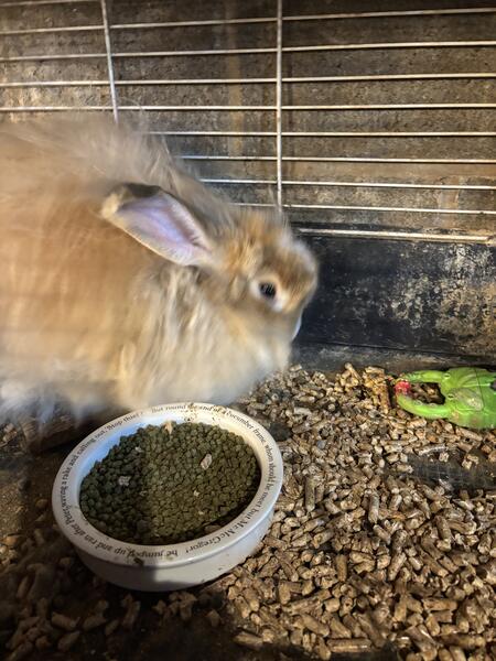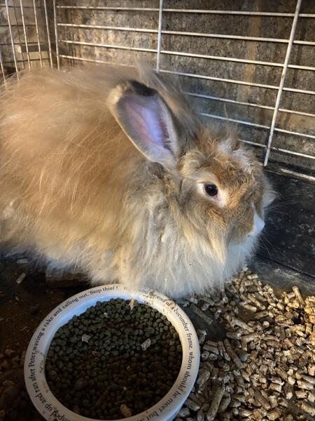 Dad is French angora ( black ) mom was a blue eyed white English angora . Pick up in Newport Pa. Shes extremely sweet