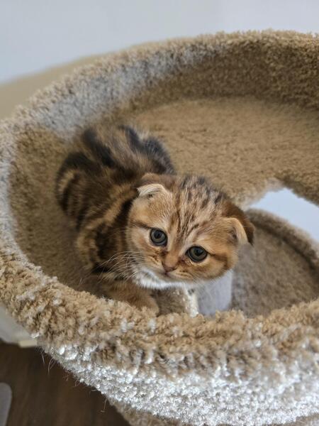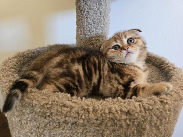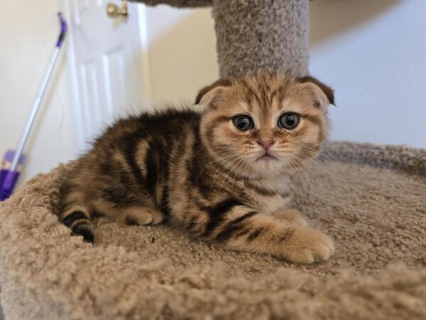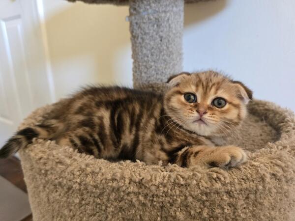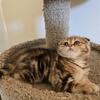 message zvisnadul about this ad Beautiful Scottish fold folded ears girl for sale. The D.O.B. is May 12th. She is a very playful and affectionate brown with stripes marble color kitten with thick fluffy soft short hair. She was born and raised in a loving home environment. She loves to be around people and will often follow you as if she is a puppy. She is almost two months old and ready to go. She is vaccinated, dewormed and litter trained. Both of her parents are WCF registered. See pictures of the parents also. We have also one more girl gray marble orange and brown color from the same litter straight and folded ears kittens. Please check Instagram video. If you are interested, text or call: 267-939-7901 Zak |