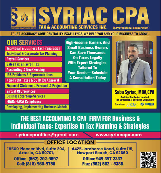 message srccpm4131 about this ad Syriac CPA Tax And Accounting Services Trusted Certified Public Accountant firm serving Artesia & Newport Beach, California. We specialize in tax preparation, bookkeeping, payroll, business consulting, and IRS representation. Whether youre an individual or a business, we provide expert financial solutions to help you save time and money. Call now for a consultation! |