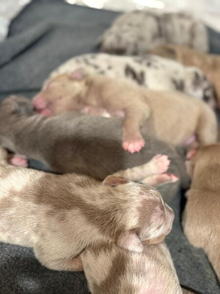 message jkghh602 about this ad DESIGNER LITTER 9 American Bully XL pups, ready to go for Xmas. Both parents have amazing temperament and family dogs. 7 males, 2 females. Message for futher details. Located in West Kootenays, BC. 5 merles, one blue nose, 2 champagne, amazing colours. |