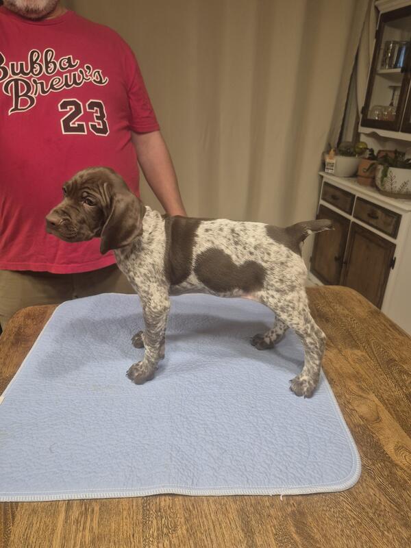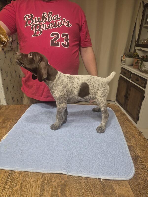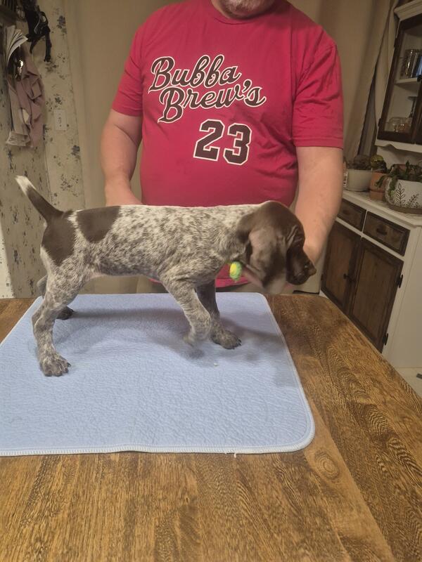 message gspmom about this ad 4 AKC registered German Shorthaired Pointer puppies just in time for Christmas! Whether you're a hunter or a snuggler they are perfect for either or both. 1 male, 3 females-tails are docked, dew claws removed, vet checked/shots and weaned. They have been introduced to loud noises, children (not infants or toddlers yet) and are well socialized with other animals. Both parents are on site. Dalton Homestead is located in Wilmington, OH. |
