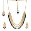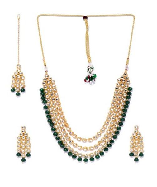 message rohinee about this ad Product Code: 10665380 This handcrafted jewellery set consists of a necklace, a maang tika and a pair of earrings Green gold-plated kundan-studded and beaded layered multistranded stranded necklace, secured with a adjustable drawstring closure A pair of matching drop earrings, secured with a post and back closure A pair of matching maang tika, secured with a hook closure Warranty: 1 month Warranty provided by Brand Owner / Manufacturer Maximum length of necklace: 52 cm Length of earrings: 8 cm Length of maang tika: 17 cm Fashioned after ethnic jewellery designs, the necklace set, embellished with stones, has been handcrafted. Wear this with a saree and look gorgeous! Material: Alloy Plating: Gold-plated Stone type: Kundan and artificial beads httpsmyntr.it/jk686B9 |