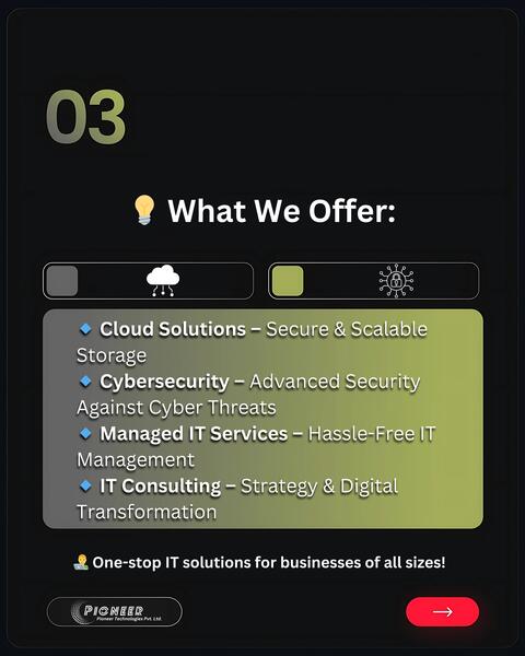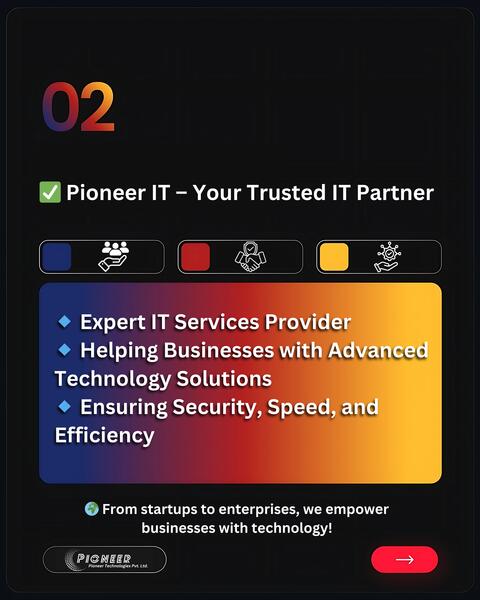 message pioneertechnologies about this ad Pioneer Technologies Pvt. Ltd. is provides IT Consultancy, IT Infrastructure, IT Services, Cloud and Web Solutions, We are providing complete end to end solutions at every level of your IT requirements. Established in 1997 |
