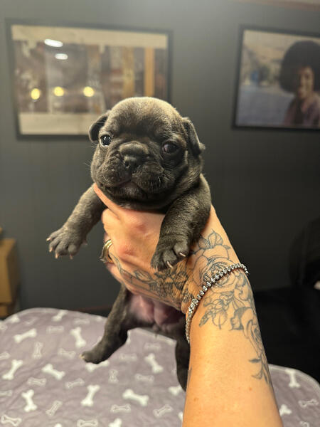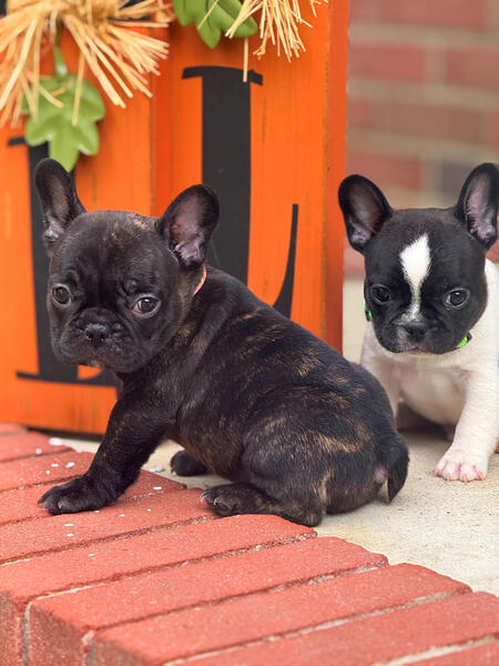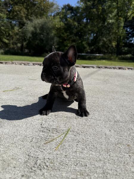 message llsnc5317 about this ad Born 8/6/2025 this brindle Frenchie girl is a compact bundle of charmher coat is a beautiful mix of dark brown and black striping, almost like tiger stripes woven into velvet. Her round, bat-like ears stand tall, giving her an alert but playful look. Big, expressive eyes melt hearts instantly, and that signature short snout makes her look both mischievous and sweet at the same time. Shes stocky yet dainty, waddling with confidence, and full of personalityequal parts snuggly lap dog and silly little clown. Whether shes zooming around in bursts of puppy energy or curling up for naps, she radiates cuteness and character in every move. Vet check Papered Vaccines Deworming |