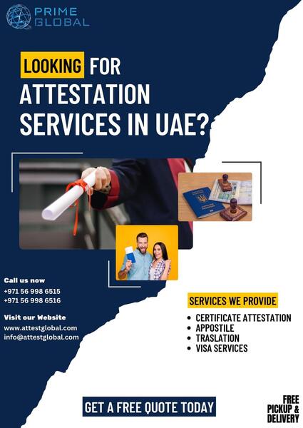 message attest832 about this ad Prime Global Attestation is the most reliable attestation company all across the UAE. We offer Certificate Attestation and Apostille services to countries like the US, UK, Germany, and Canada India, Pakistan, and 140+ countries with a hassle-free process and a minimum document requirement. We believe in the mantra of having the best customer satisfaction and served more than 10,500 clients all across the Universe Our services include Marriage certificate attestation, Birth certificate attestation, educational attestation, transfer certificates, medical certificates, police clearance certificates, etc. Our experts will help you get the certificate attestation effortlessly. For any query, call us now! contact our support team 0569986516 our website: httpswww.attestglobal.com Visit our head office: 105 Al Rai St Mohamed Bin Zayed City, ME-11, Abu Dhabi, UAE You can visit our Branch office: W-14, 15th Floor, Al Musalla office Tower, Khalid Bin Waleed Road, Bur Dubai, UAE message attest832 about this ad |