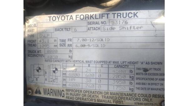 message trustworthyequipment about this ad For Sale 2014 Toyota 8FGU25 Dual Fuel Forklift New Cambria, Missouri Available through Trustworthy Equipment LLC Key Details & Condition Model: Toyota 8FGU25 Dual Fuel (Gasoline / LP) Year: 2014 Hours: ~4,600 hours Condition: Excellent everything works as it should Specs & Technical Highlights Load Capacity: 5,000 lbs (2,250 kg) Engine: Toyota 4Y-ECS, dual fuel configuration (Gasoline / LP) Lift Height: Approx. 131.5 in. (10.9 ft) Free Lift: 6.1 in. Operating Weight: ~8,000 lbs Tires: Pneumatic excellent for outdoor and mixed-terrain use Brakes: Hydraulic service brakes & mechanical parking brake Drawbar Pull: Approx. 4,250 lbs Selling Points Dual fuel flexibility run on gasoline or LP depending on your setup Low hours for its age, well-maintained, and ready to go to work Smooth mast and hydraulics tested and working properly Rugged pneumatic tires suited for outdoor surfaces Trusted Toyota build quality with easy parts availability Contact Us 531-220-0956 Trustworthy Equipment LLC Where Quality Meets Integrity message trustworthyequipment about this ad |