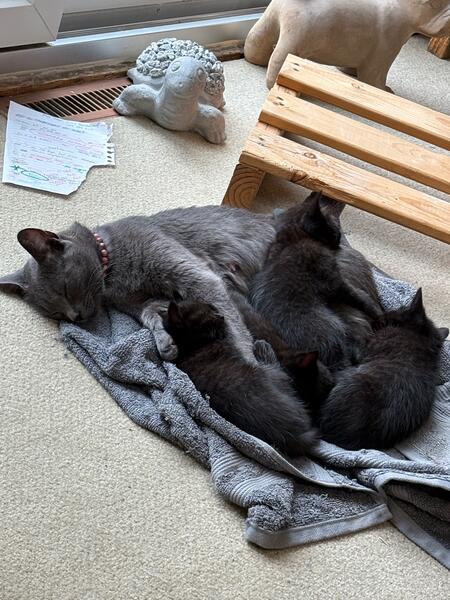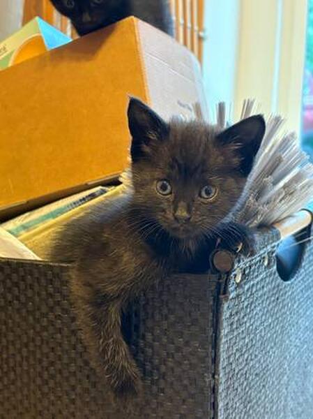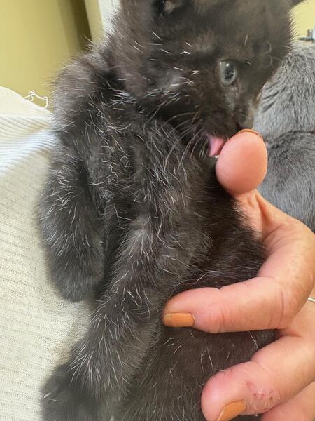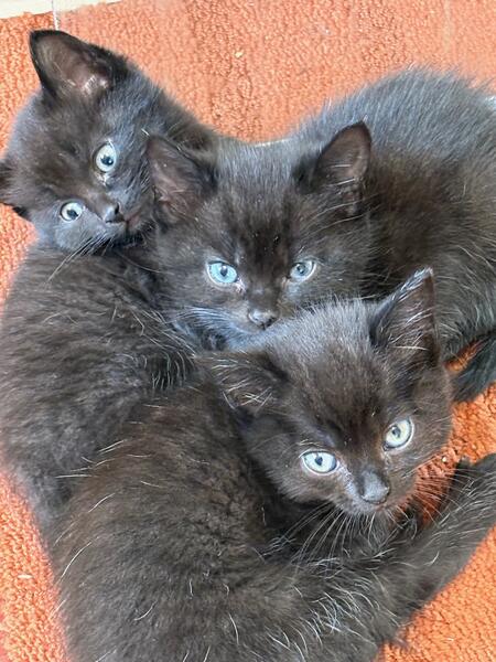 message anne about this ad I am fostering four 6.5 week old kittens - all black - one female, three male - using litter boxes - starting to eat kibble - still nursing but will be ready for new homes in about 1.5 weeks. They are fast friends already and playing hard. They are inside while fostering. I only wish for a very loving home for these precious babies. Mama kitty is very young - she is a gem - also needs a new home. I don't think she is even a year yet. She was outside when she birthed these little ones and has been inside since I got them at 1 week old. She longs to be out, but will adapt to being in. She is from a barn/farm and was not spayed (needs spayed after she is done nursing) |