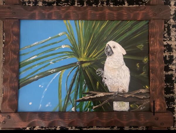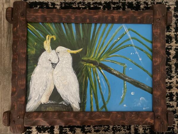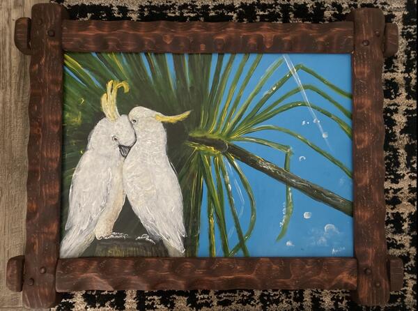message peaceonearth about this ad $800 for set or $450 sold individually. Cockatoo Love set are acrylic on wood. 14x19 in. New frames, framed to match, papered, and ready to hang. |
