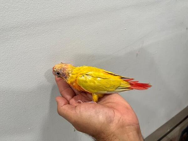 Sun Cheeks conure hatched 2025. 305 321 2130 Shipping available. Our birds are raised with maximum love and dedication. Thank you.