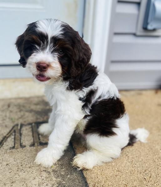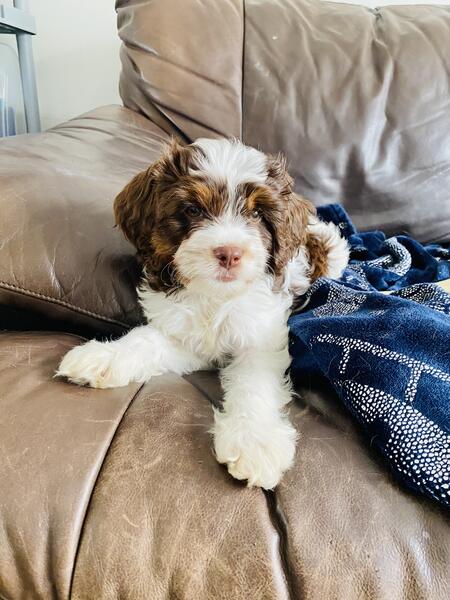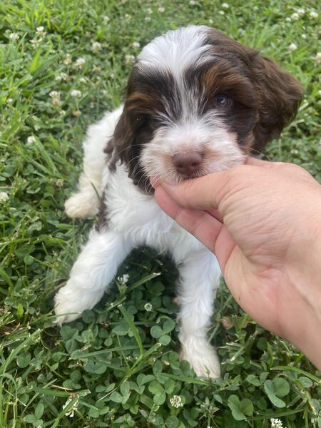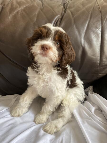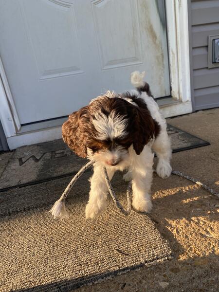 While cavapoos are common, finding a chocolate one is not! Its gives that beautiful color and eyes! Meet Maggie Moos! She was born may 25th and 12 weeks old. Both her parents are Akc and health tested. She is a tenacious fluff ball, and hypoallergenic! She is doing great potty training and has done ok with the leash so far.
