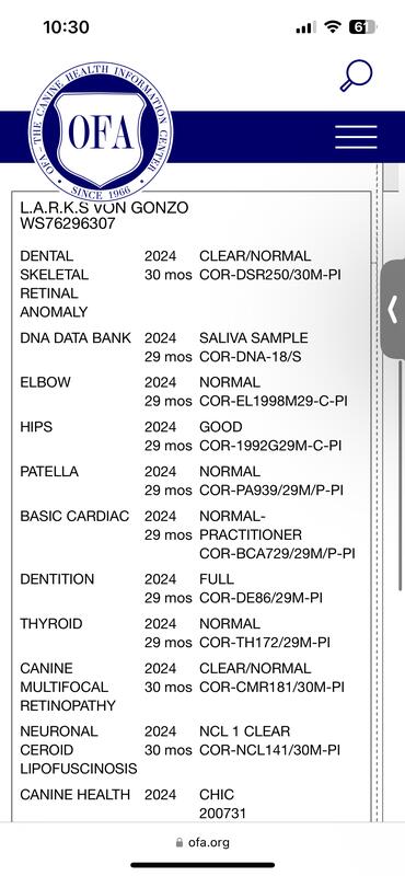 message lazyaranchandkennels about this ad Siri is the last of the litter. She is very smart, knows how to sit, loves to play fetch, but will also curl up on the couch and lounge all day, she is also trained to a doggy door. She is utd on shots including rabies. She had Cherry Eye surgery that healed up great. i am not in this for the money, her surgery was $500. My dogs come from a long line of health testing and i am very proud to have my chic certs on my dogs. i have started siris health testing as well. Dad is a big block headed male, comes from good show lines. Dad is akc and iccf. Dads genetic testing results: DSRA-clear Cardiac-normal Dentition-full elbow-normal Hips-good Patellas-normal Thyroid-normal CMR-clear nCL1-clear Chic#200731 if anyone wants to look up on ofa website. Mom is a big formentino female that also comes from show lines. Mom is only iccf lines. Awaiting some of moms ofa results as the holidays have put stuff behind. DSRA-clear NCL1-clear CMR-clear Dentention-full Asking $500.00 Located in Brazil, Indiana Call/text 812-240-9232 Or visit us on Facebook message lazyaranchandkennels about this ad |