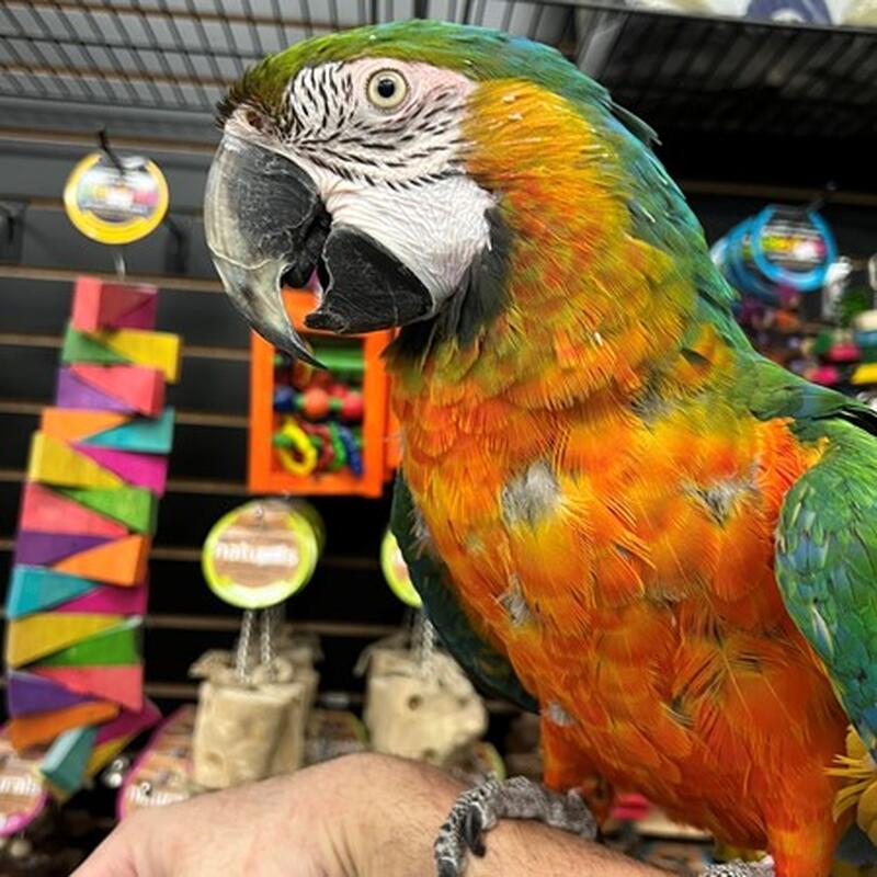 Hand tame adult Catalina Macaw Hybrid, very beautiful color feathering. Call us for more info 773 317 3785.