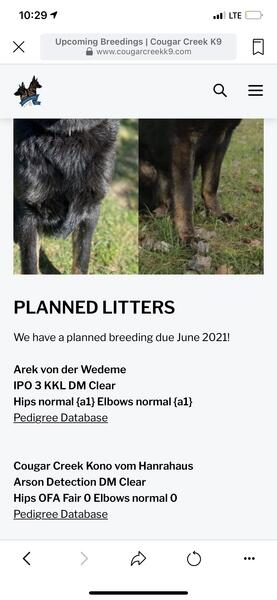 message cowgirlup18 about this ad Books are open for 2025 to select females! We require a $200 booking fee (non-refundable Remainder of stud fee is not due until first lock has been made. Cooper is a gorgeous black German shepherd proven stud. He is titled an has a completely clear genetic panel, including DM-Clear. Cooper is dual registered AKC an UKC! I will get a better stack picture of him. Message for more info! My website- AKC Titles: BCAT ATT (AKC Temperment Test) OFA Testing: Hips- Excellent Elbows- Normal Eyes- Normal Heart- Normal Patellas- Normal Coopers parents are pictured above in pic with two dog. Here is links to there info as well! Sire: Arek von der Wedeme IPO3 Kkl passed Sire Born: 20. September 2012 Hip: SV: HD a-normal (a1) - Elbows: SV: HD a-normal (a1) Dam: Cougar Creek Kono Vom Hanrahaus Arson detection Dam born: 07. July 2018 Hip: OFA: Fair (GS-106387F30F-NOPI) - Elbows: OFA: Normal (GS-EL44581F30-NOPI) message cowgirlup18 about this ad |