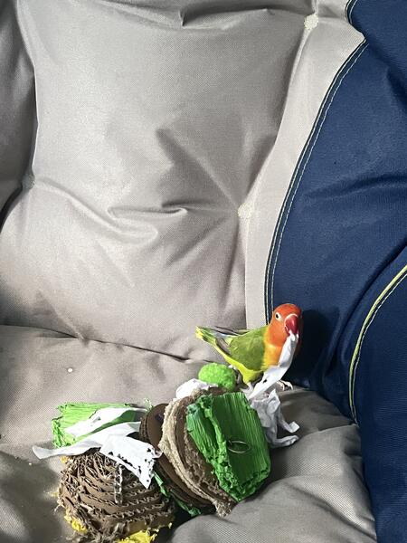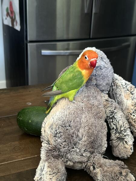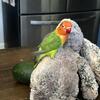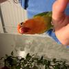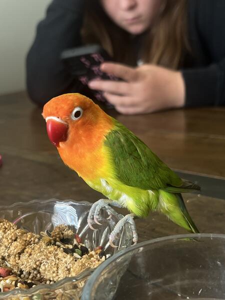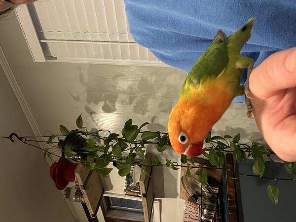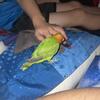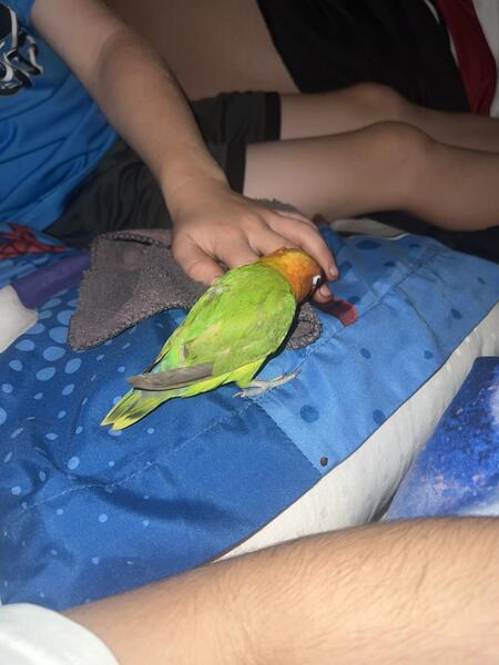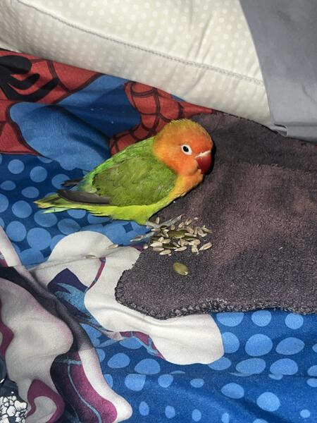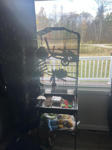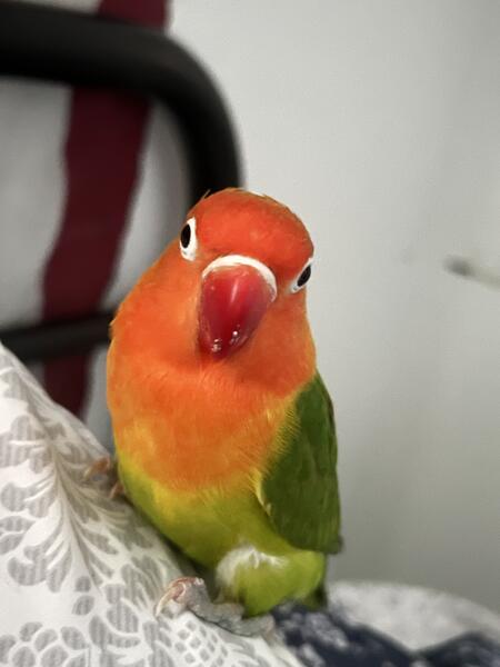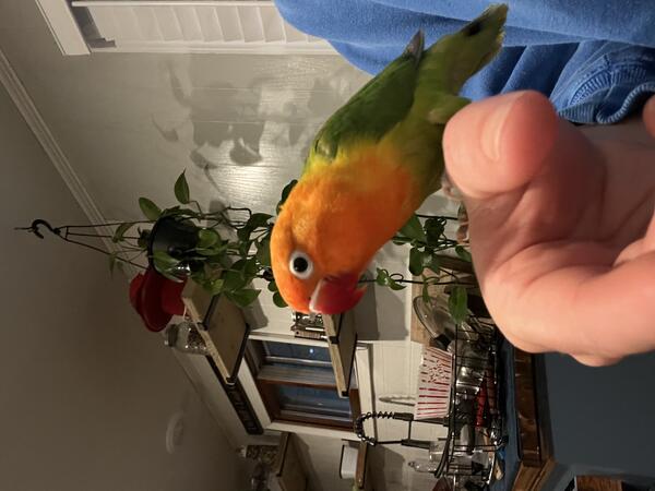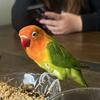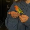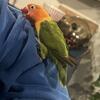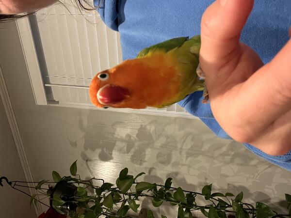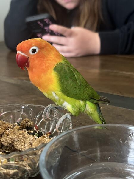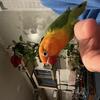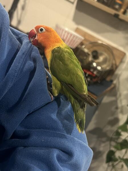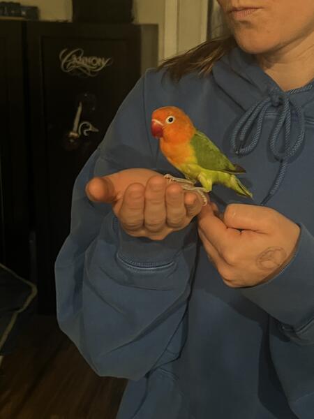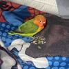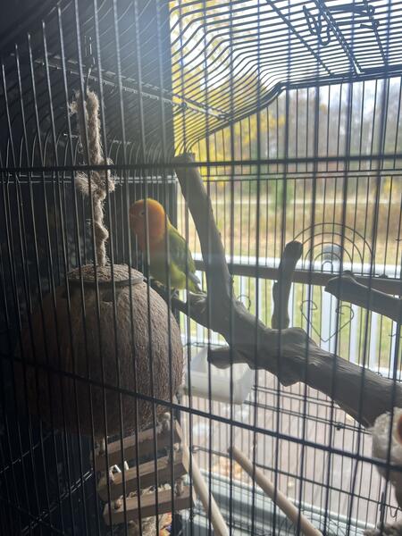 About 8 month old lovebird, not hand tame but friendly loves dogs. Comes with cage and accessories located in Tawas.
