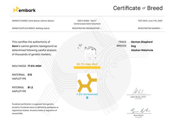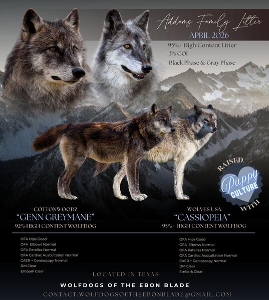 message wolfdogsebonblade1 about this ad Wolfdogs of the Ebon Blade, located in Johnson County, TX. Genn and Cassie are being paired for a litter of 95 high content wolfdogs, to be born in April 2026. Genn and Cassie are both affectionate, intelligent, easy to handle year-round (no seasonal aggression aka "Winter Wolf Syndrome and are friendly towards strangers. This litter will be an excellent opportunity for licensed facilities who are seeking an ambassador animal prospect. These puppies will also be excellent companions for active homes who want to include their wolfdog in their daily life and activities. This is the ONLY pairing of high content wolfdogs in North America where BOTH parents are fully mature adults who are still comfortable and confident going out in public and meeting new people. Black phase and wolf grey coat colors are possible with this litter. The estimated COI is only 3% according to Embark. Both Genn and Cassie are OFA health tested with passing scores for hips, elbows, patellas, eyes, and cardiac health. They're also clear of all testable genetic disorders on Embark's genetic health panel. The puppies will be bottle fed and intensively socialized before going home. They will already be microchipped and Embark Breed + Health DNA tested - you get added to your puppy's online profile as a shared owner. Our puppies are dewormed every 2 weeks and go home with their first round of puppy vaccines, a Health Certificate from our vet, and a generous puppy package to start them off on the right foot with their new families. We provide lifetime support and free professional training advice. message wolfdogsebonblade1 about this ad |