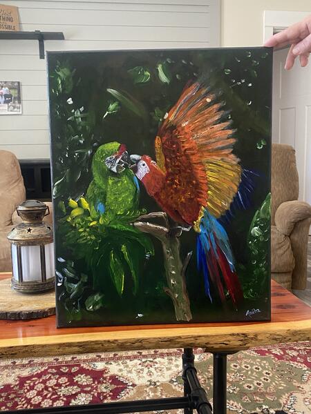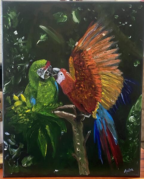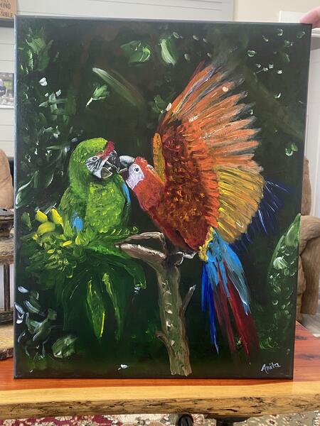 message peaceonearth about this ad Absolutely Exotic! This is a real-life scene of a male Macaw feeding his female mate, a common occurrence during mating season. Macaw Madness is a 16x20 in. Acrylic on stretched canvas. Not framed. Ready to hang. |
