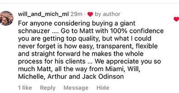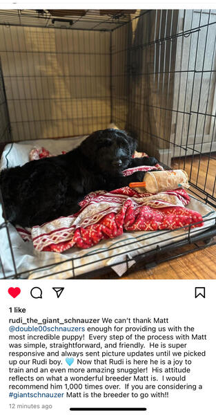 message mkrsc261 about this ad Puppies available Giant schnauzer puppies available to new homes. Registered with the AKC and NAPR. Up to date on all shots. House broken, crate trained, starting leash work and basic obedience training. Beautiful capable puppies. Giant Schnauzer Stud Service available. AKC registered Male stud- $1,700 fee Find more at www.double00schnauzers.com for more information. Call or text: 201-248-8272 |