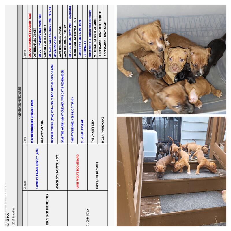 message jl3kennels about this ad JEEP ELI CARVER/ EL TITERE BLOODLINES PUPS 2 left red male and red fed female UP TO DATE ON SHOTS AND DEWORMING BORN ON 6/12/2025 ADBA REGISTRY SIRE BDL'S DICK THE BRUISER / DAME LOCKETT'S NOVA One male left TEXT 3RD @ 313-546-4528 WILL DELIVER WITH IN 8 HOURS OF DETROIT MI. ADDITIONAL FEES UP TO 500 |